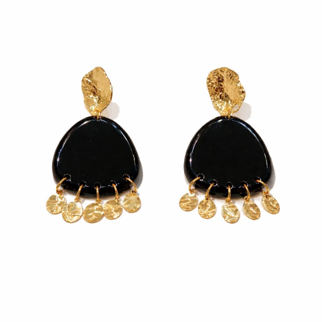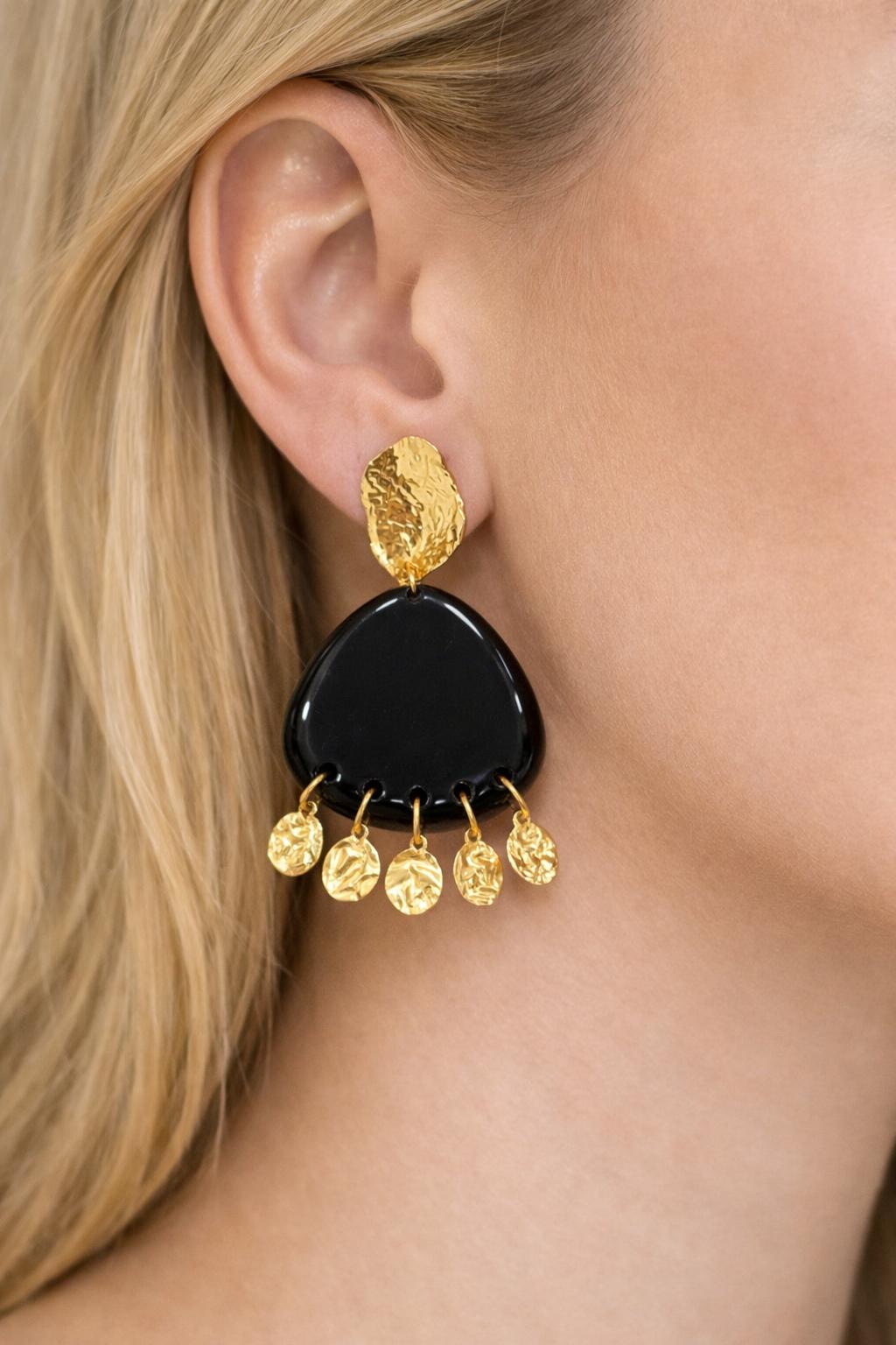 Craquez pour ces boucles d’oreilles au design raffiné, alliant un noir profond brillant à des finitions dorées texturées. Leur forme originale est sublimée par de délicates pampilles dorées qui apportent du mouvement et captent la lumière avec élégance.