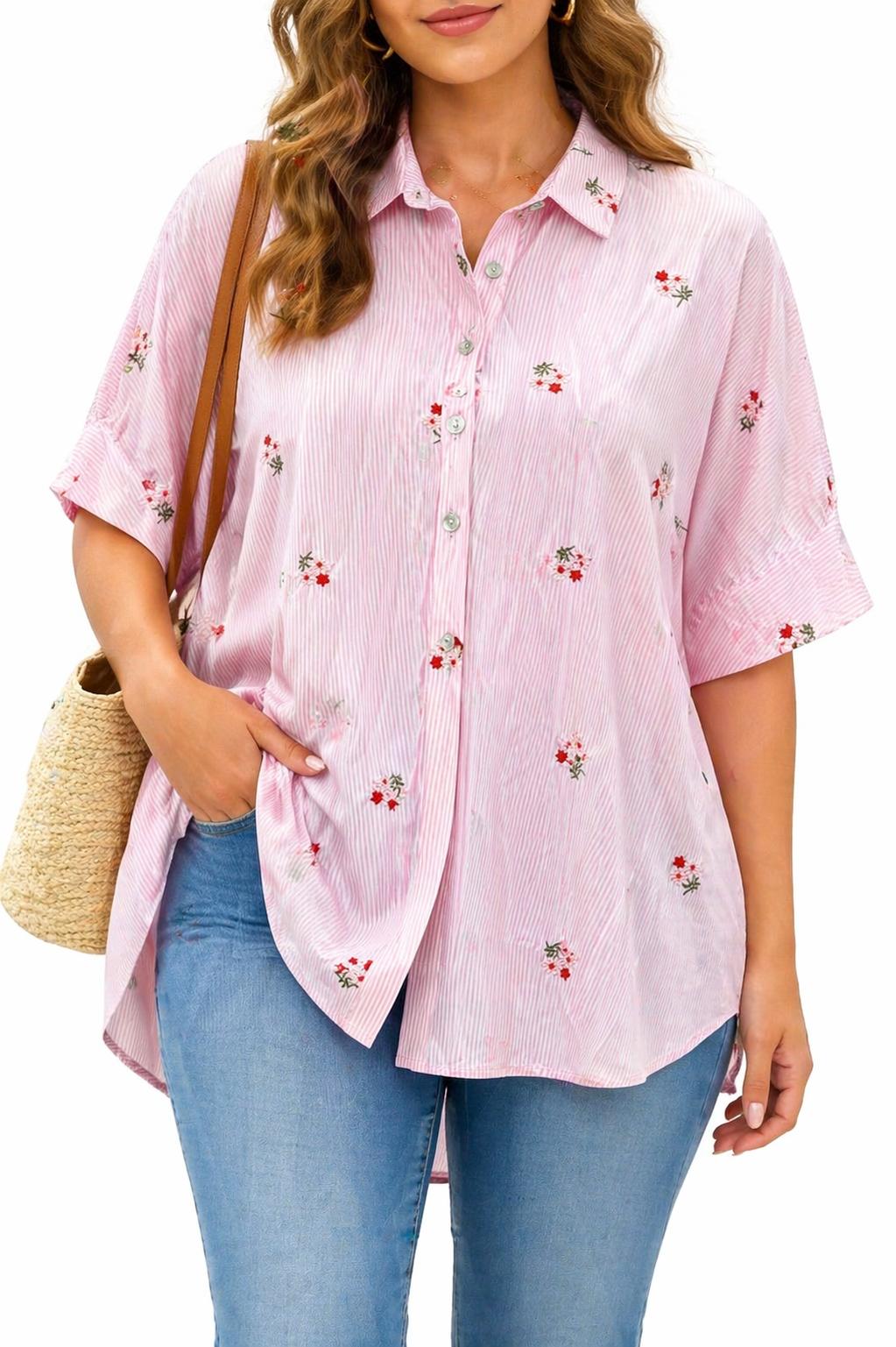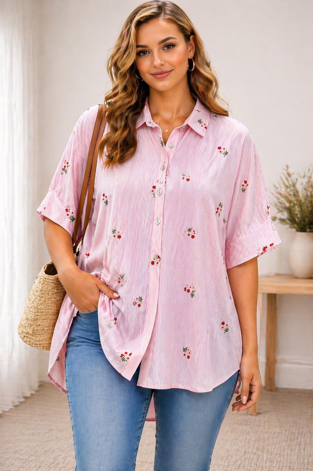 Laisse-toi séduire par cette jolie chemise rose aux fines rayures, délicatement ornée de petites broderies florales 🌸