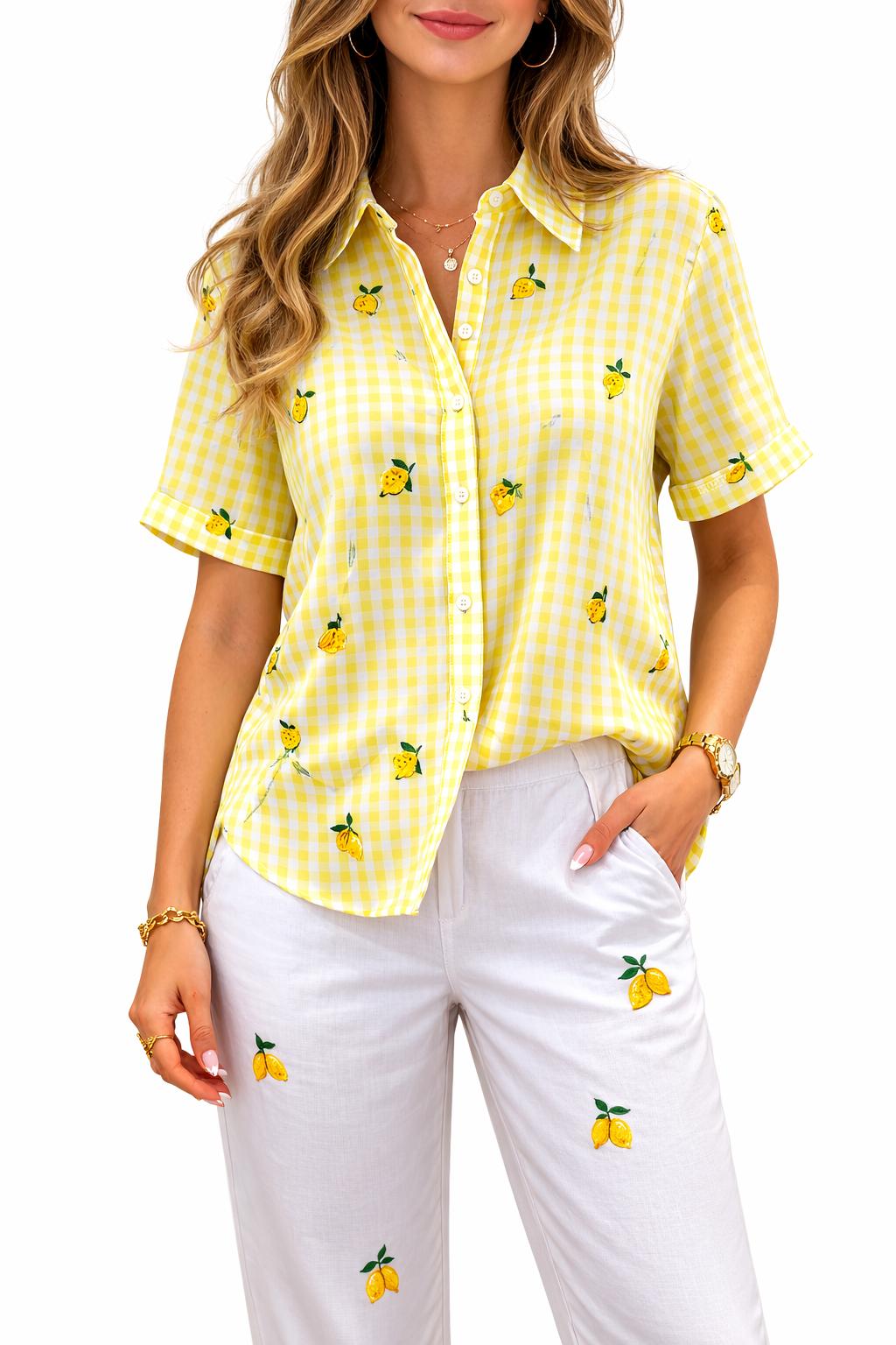 Craquez pour cette chemise fraiche et lumineuse au motif vichy jaune, sublimée par de délicates broderies citron pour une touche estivale et originale.