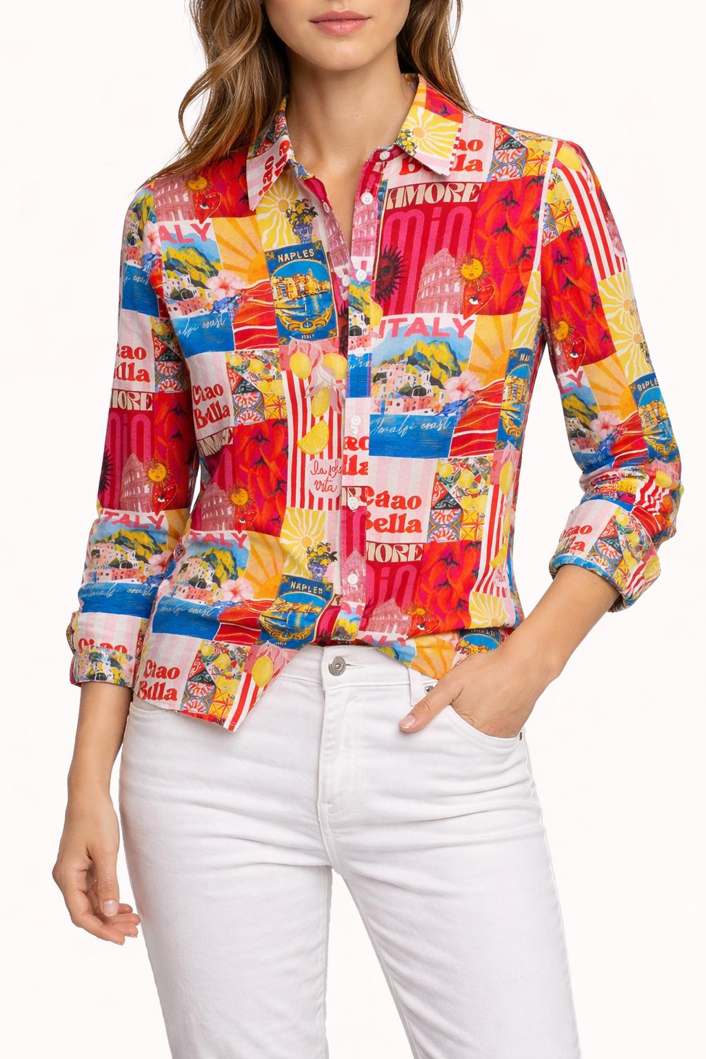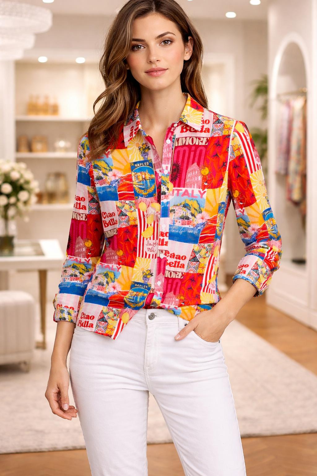 Apportez du soleil à votre dressing avec cette chemise aux inspiration italiennes. Son imprimé patchwork mêle paysages citrons et message ciao Bella pour un style unique et ultra tendance.