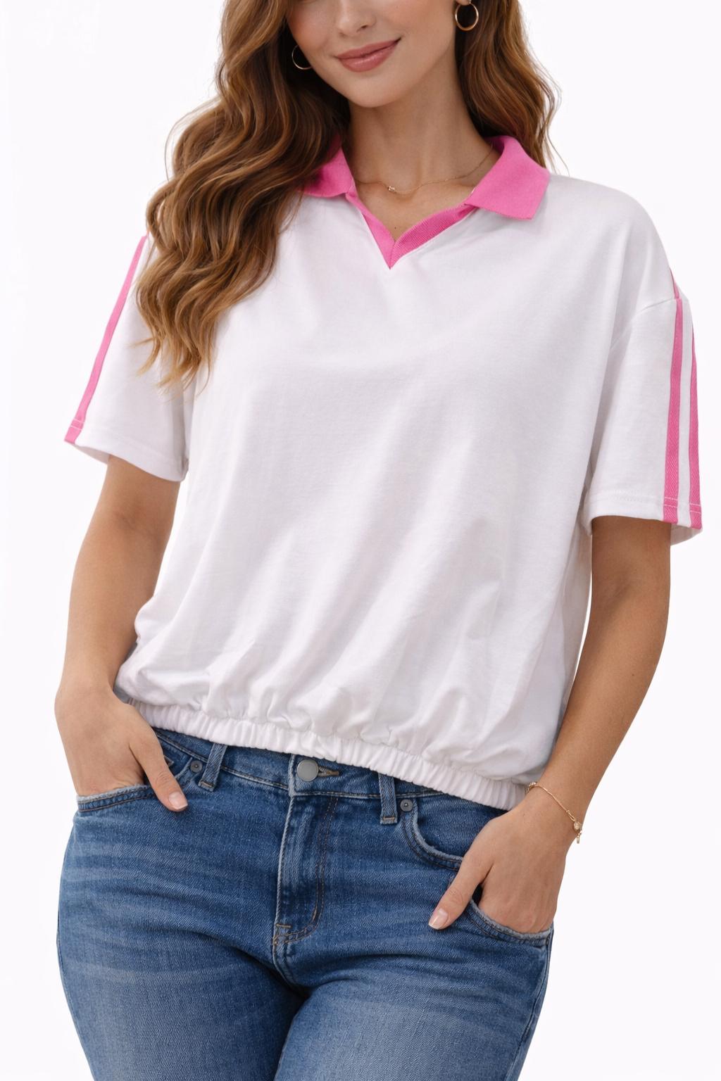Craque pour ce t-shirt à l’allure moderne et féminine, parfait pour un look décontracté mais soigné. Son col polo rose apporte une touche tendance et lumineuse, tandis que les bandes contrastées sur les manches ajoutent du style.