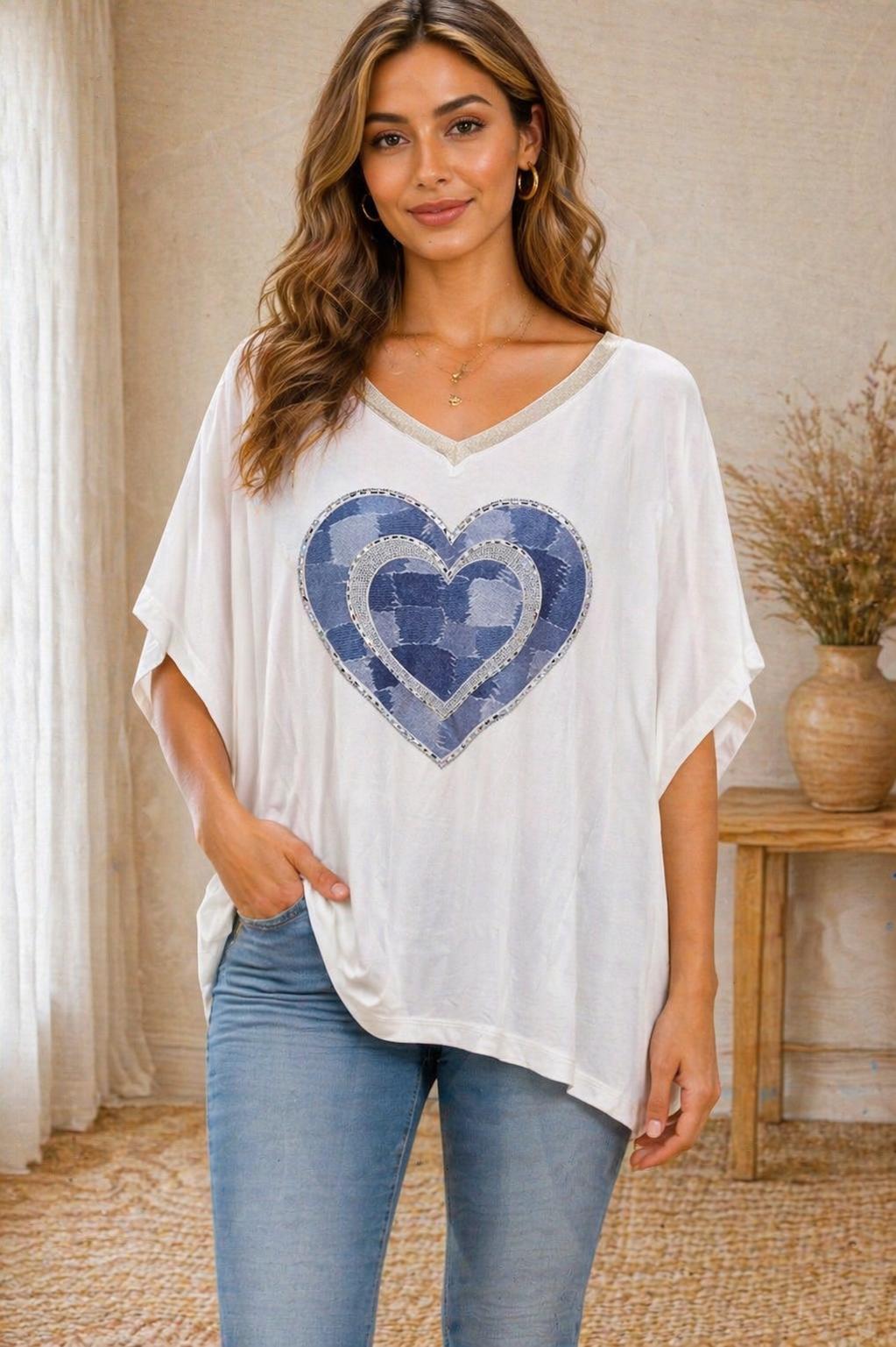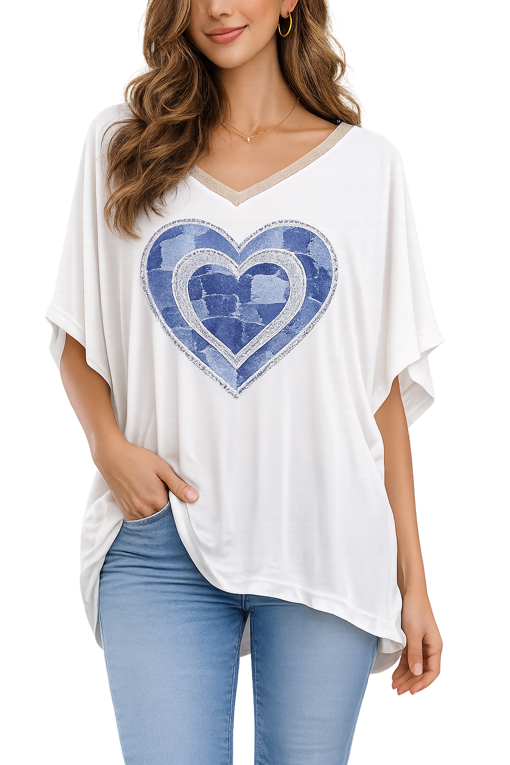 ✨ T-shirt blanc cœur denim – Chic & décontracté